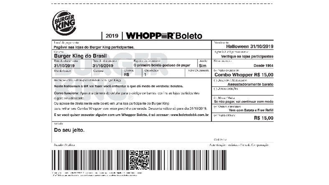 Para brincar com isso, o Burger King decidiu trazer em sua nova campanha de Halloween o Boleto Whopper. A partir de hoje, dia 28, os fãs da marca receberão de diferentes formas, boletos que simulam uma nova conta para pagar, mas que na realidade são um cupom de desconto.